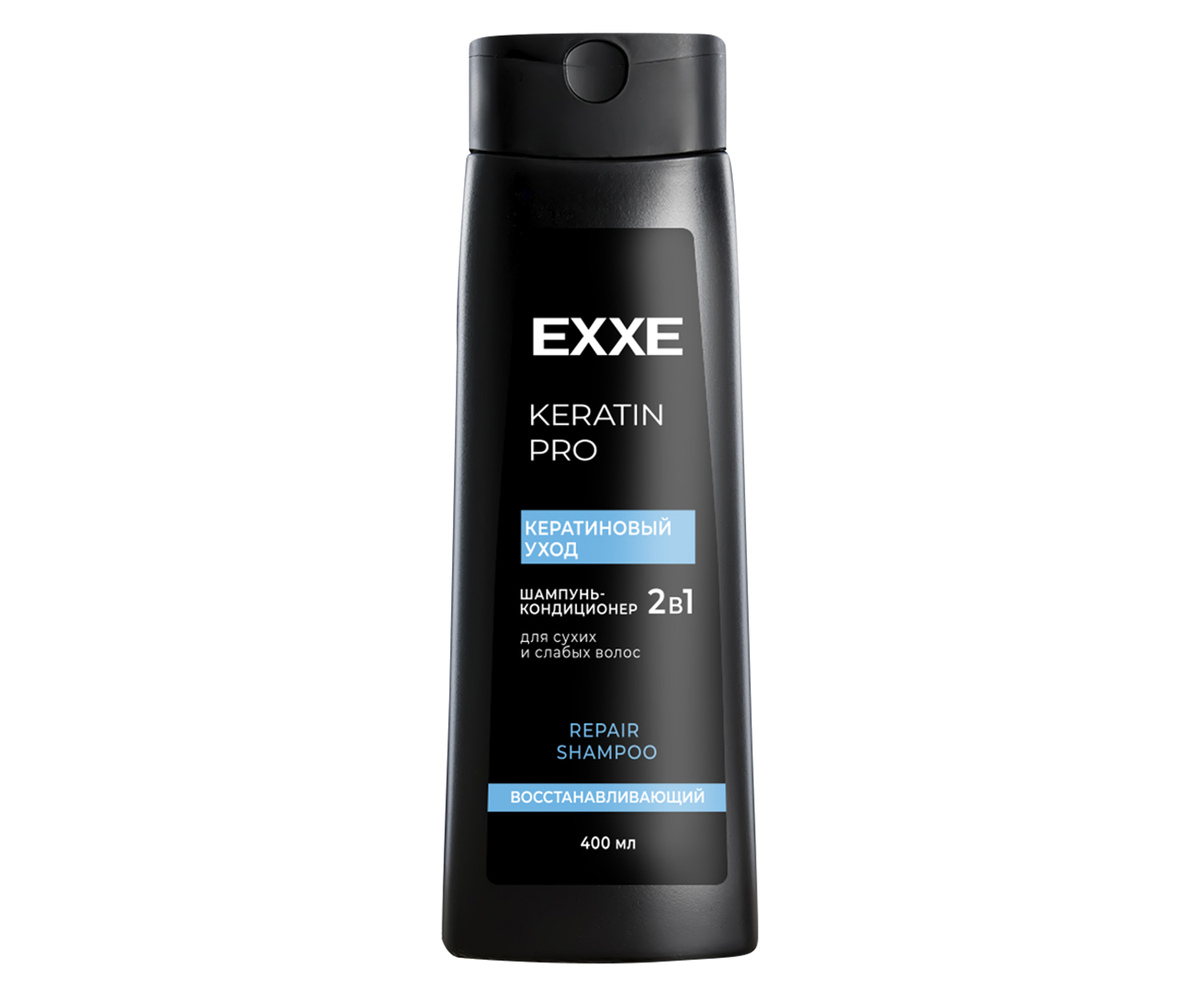 EXXE Шампунь-кондиционер для волос 2в1 KERATIN Кератиновый уход, 400 мл Восстанавливающий шампунь мягко очищает и питает волосы до самых кончиков. Насыщенная формула с кератином придает волосам блеск и объём, делая локоны шелковистыми и послушными.