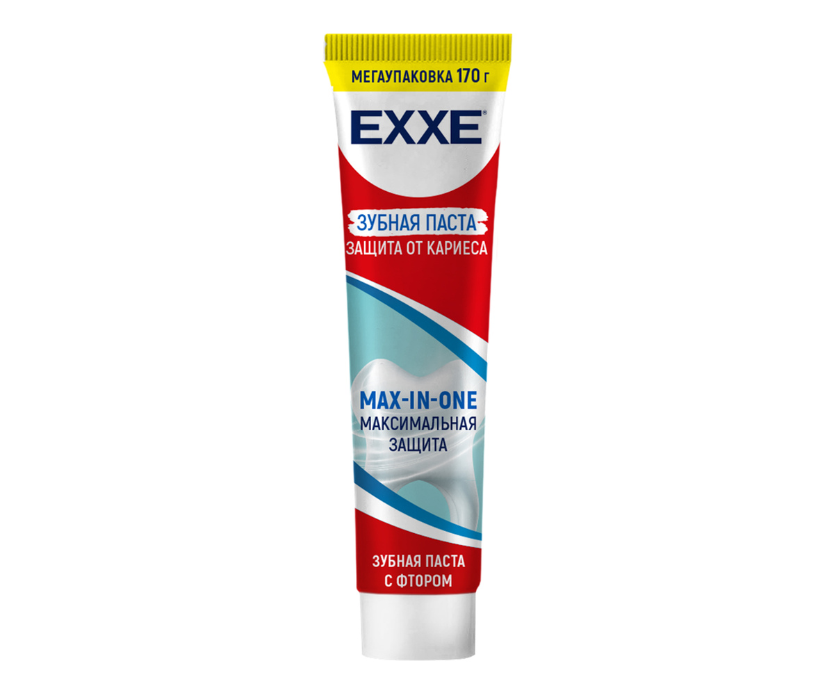 EXXE Зубная паста Максимальная защита от кариеса Max-in-one, 170 г Зубная паста от кариеса максимальная защита.Содержит фтор и кальций для защиты от кариеса и комплексного ухода за полостью рта.